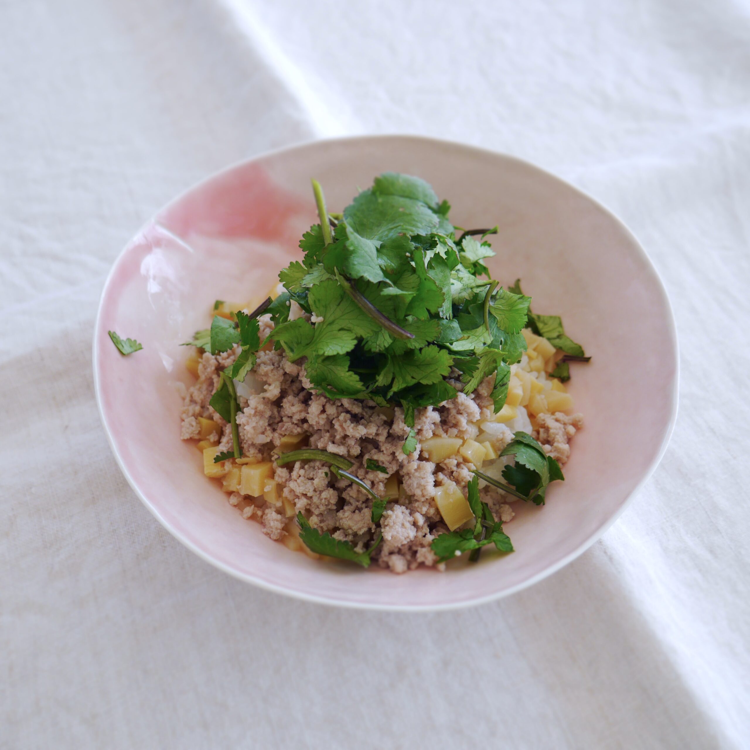 たけのこプラスのそぼろに庭パクチーのエスニックどん^^
