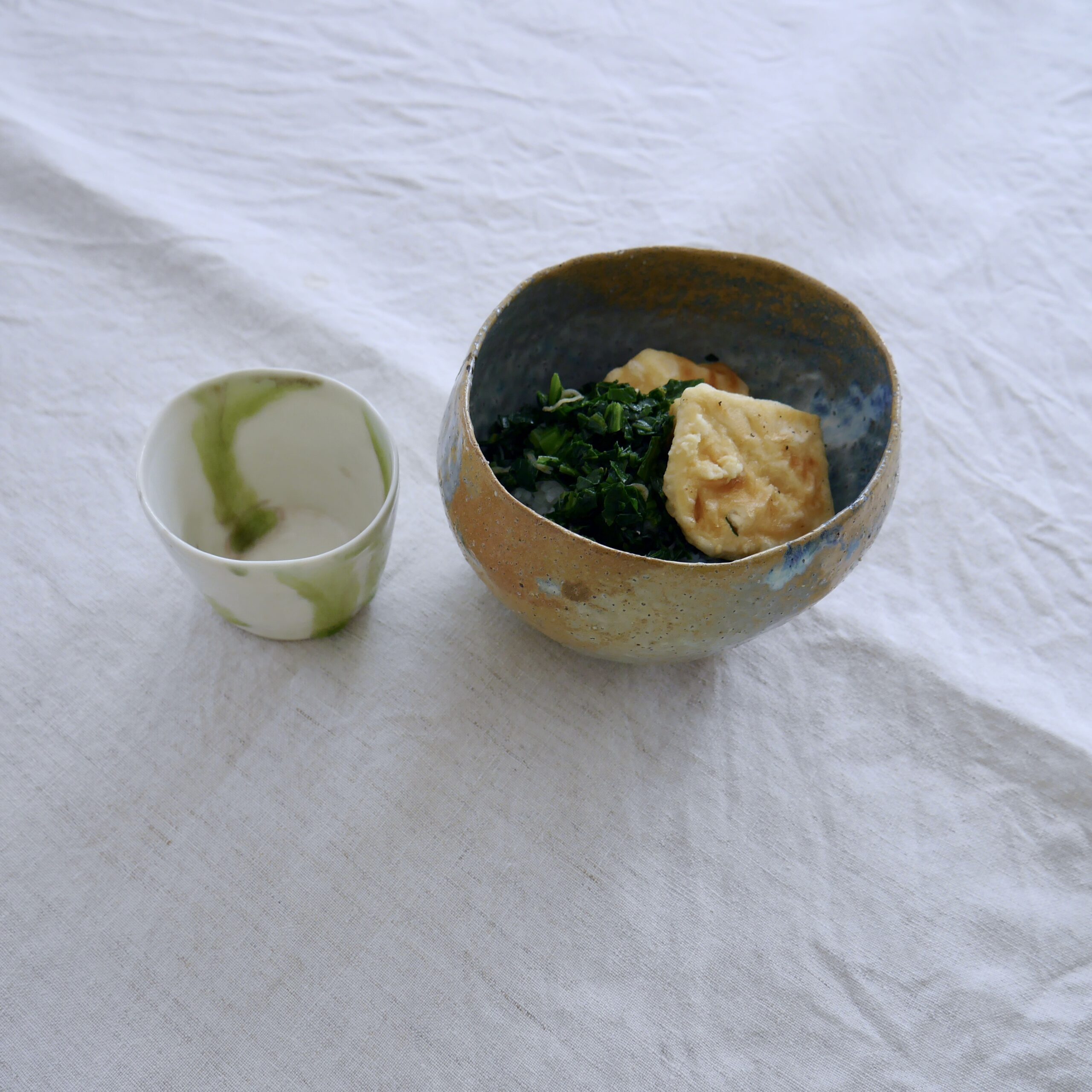じゃこと子持ち高菜の菜飯に揚げ出し豆腐をのっけてみたら美味しいのでは・・といっしょにのっけごはんにしてみました^^(生姜と出汁醤油少しプラス)おおきさと形がうつわとぴったんこ〜^^(そしてのっけごはんにはまる予感〜w)