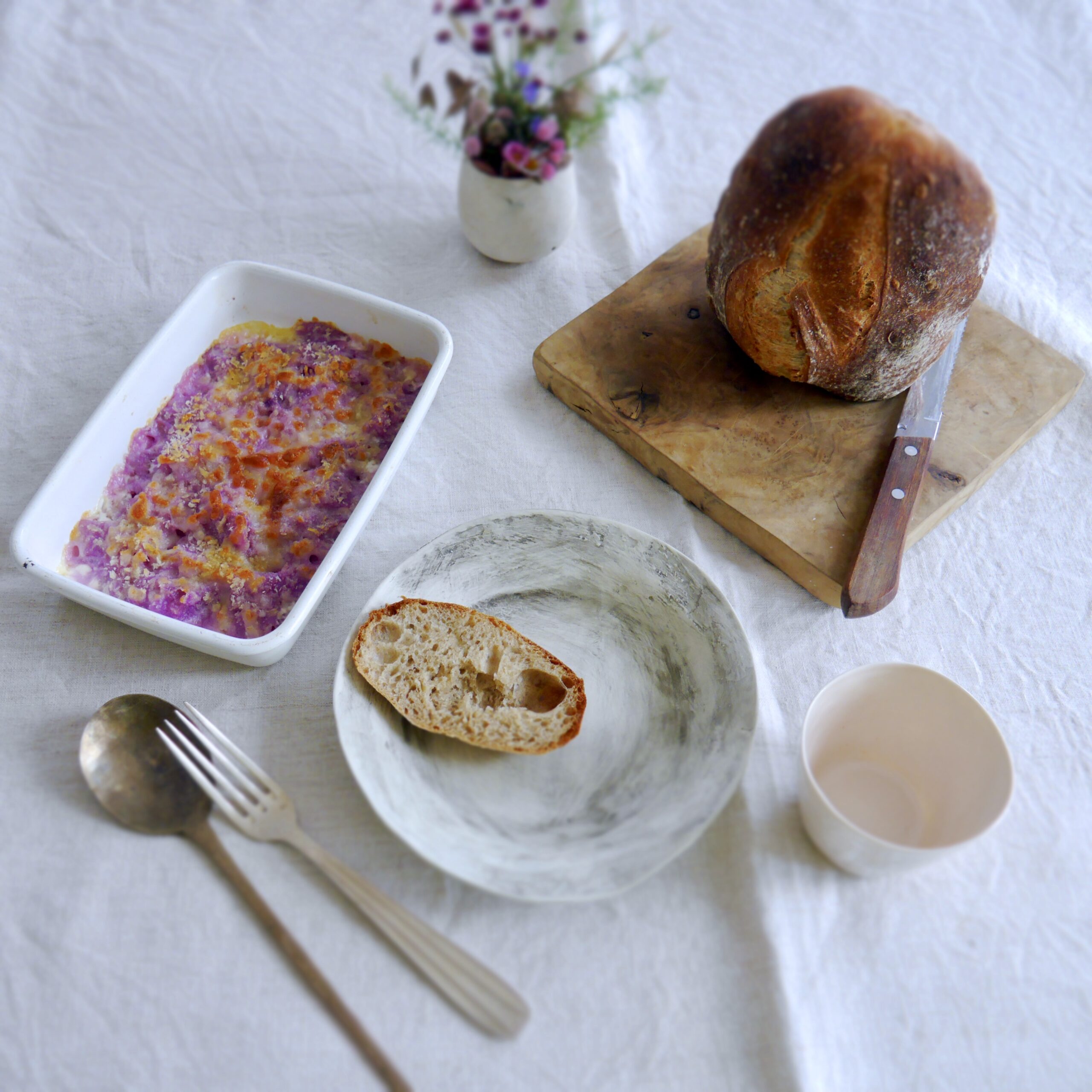 原っぱ産、むらさき自然薯を簡単グラタンに^^今日はいつものあの方に毎年の感謝の、パンのお届け。(久しぶりにパン屋並みに焼いてアドレナリンがでましたw)明日、電話をかけてきてくれるのが楽しみ〜