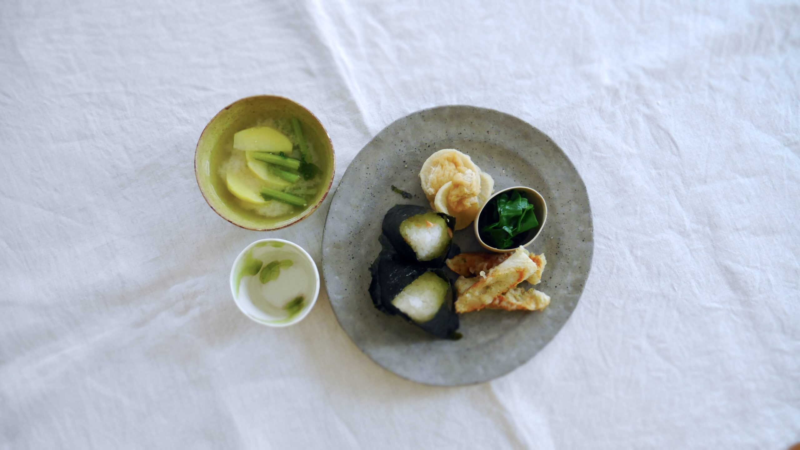 おかわかめのおひたし、じゃがいもとかぶの葉のお味噌汁)