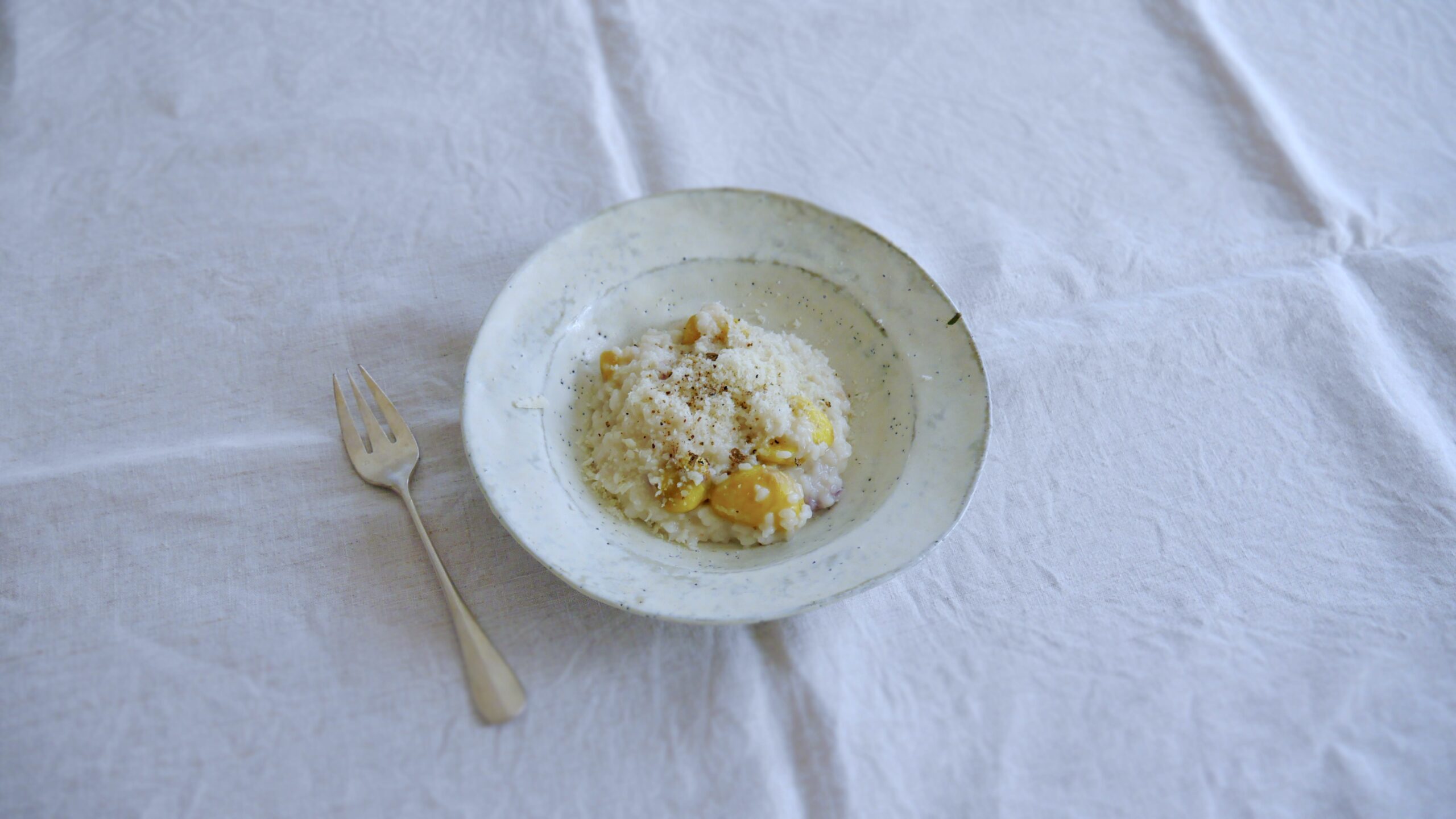 すりおろして泡立てた卵白をまぜて、ラップに包んでおちょこに入れて